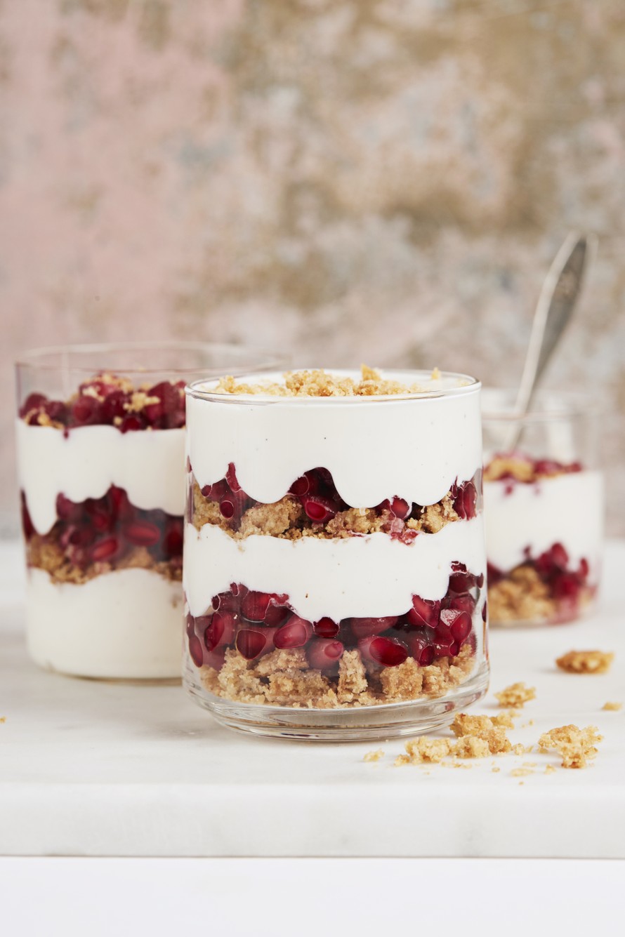 Helpompaa jälkiruokaa saa etsiä! Täyteläinen rahkavaahto, rouskuvat keksimurut ja mehukkaat granaattiomenansiemenet luovat yhdessä koukuttavan suutuntuman.