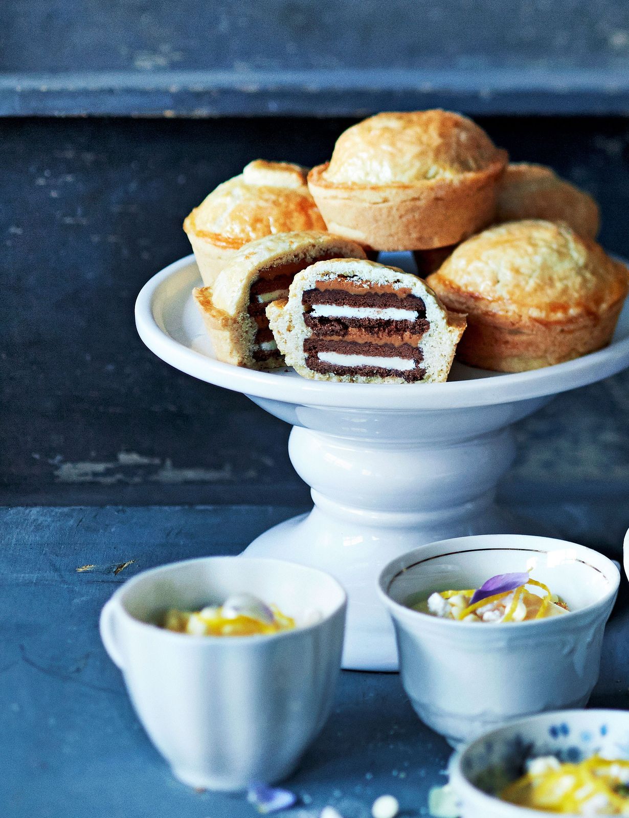 - Leikkaa lopusta taikinasta kannet. Vatkaa kananmuna kevyesti ja voitele sillä taikinakansien reunat. Nosta ne täytekeksien päälle muffinivuokiin. Voit halutessasi tehdä lopusta taikinasta koristeita. Voitele pinnat kananmunalla.