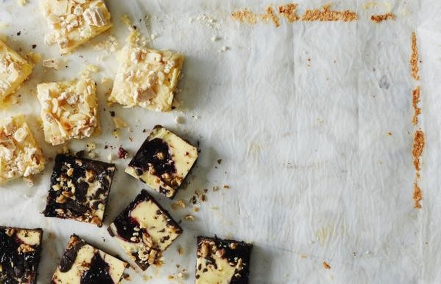 - Kaada ja levitä taikina leivinpaperin päälle uunipellille ja ripottele päälle kirsikkahilloa, mascarponea ja suklaarouhetta.