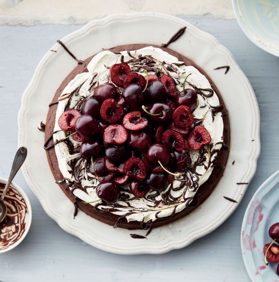 - Siirrä kakku tarjoiluastiaan. Levitä kakun päälle mascarpone-vaahto, suklaakastike ja kirsikat. Rouhi pinnalle mustapippuria.