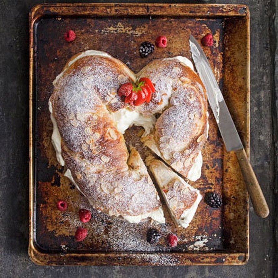 Sydämenmuotoinen mantelikranssi sisältää laskiaispullan rakastetuimmat maut. Manteli on leivottu pullataikinaan. Marjat on hilloamisen sijasta marinoitu raikkaassa limettisiirapissa.