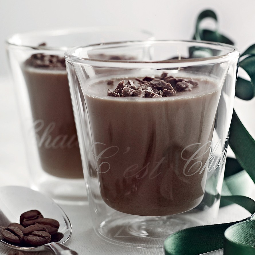 - Jaa mocca-cotta kuuteen pieneen lasiin. Peitä lasit tuorekelmulla ja pane jääkaappiin hyytymään vähintään 2 tunniksi. Koristele valmiit jälkiruoat rouhitulla suklaalla.
