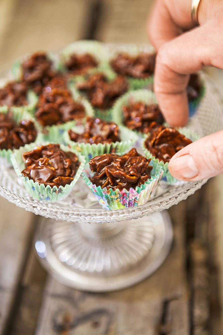 - Lisää kondensoitu maito ja sekoita puulusikalla. Lisää joukkoon paloiteltu suklaa ja voi. Lisää lopuksi corn flakes -hiutaleet ja jatka sekoittamista varovasti.