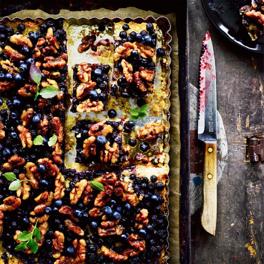 - Nosta vuoka uunista. Lisää mustikat ja pähkinätosca piiraan päälle.