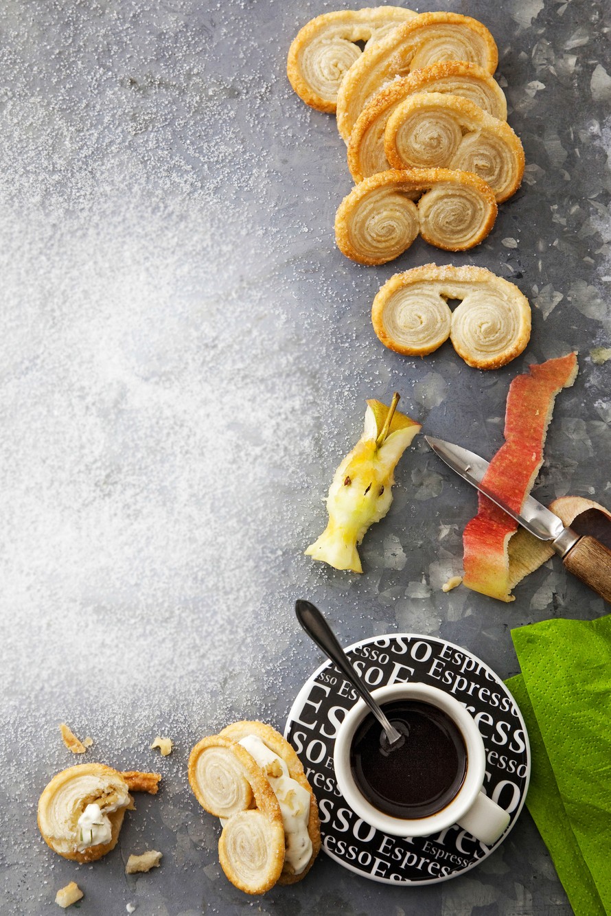 - Täytä leivonnaiset. Laita nokare hilloa, kermavaahtoa ja vähän rouhittua pähkinää 8 palmierin päälle. Nosta loput palmierit kansiksi. Nauti leivokset espresson kanssa.