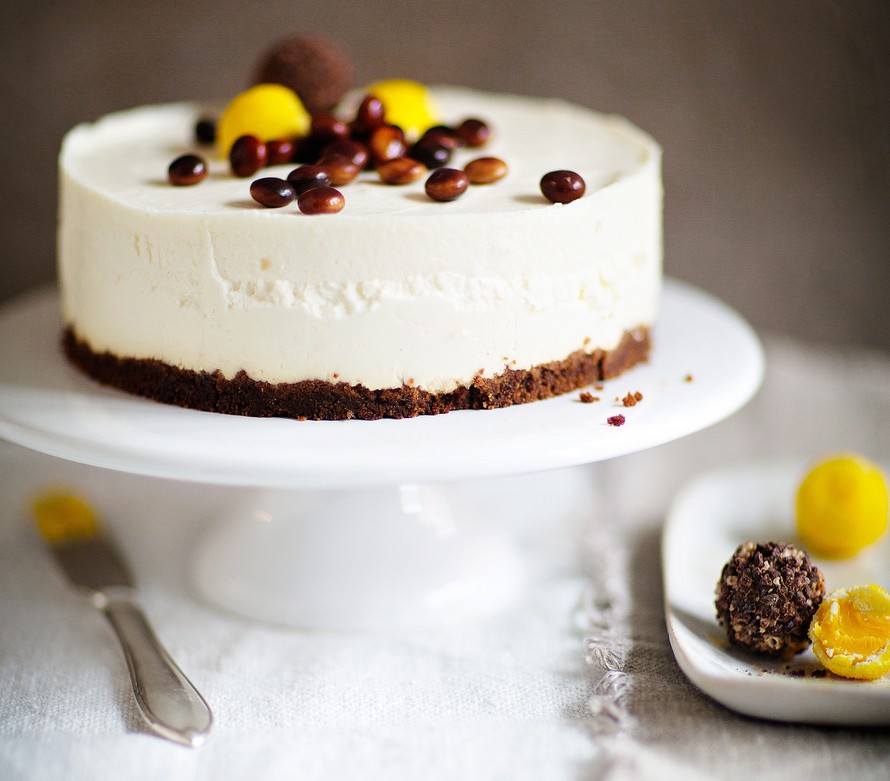 Nam! Samettisen moussekakun pohja on piparia. Pintaansa kakku saa suklaakarkkeja.