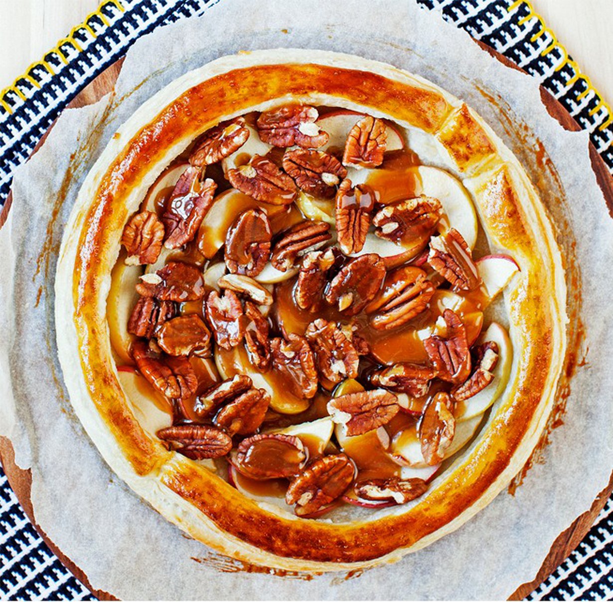 Rapea pekaani, makea kinuski ja pehmeä omena kohtaavat lehtevässä piiraassa.
