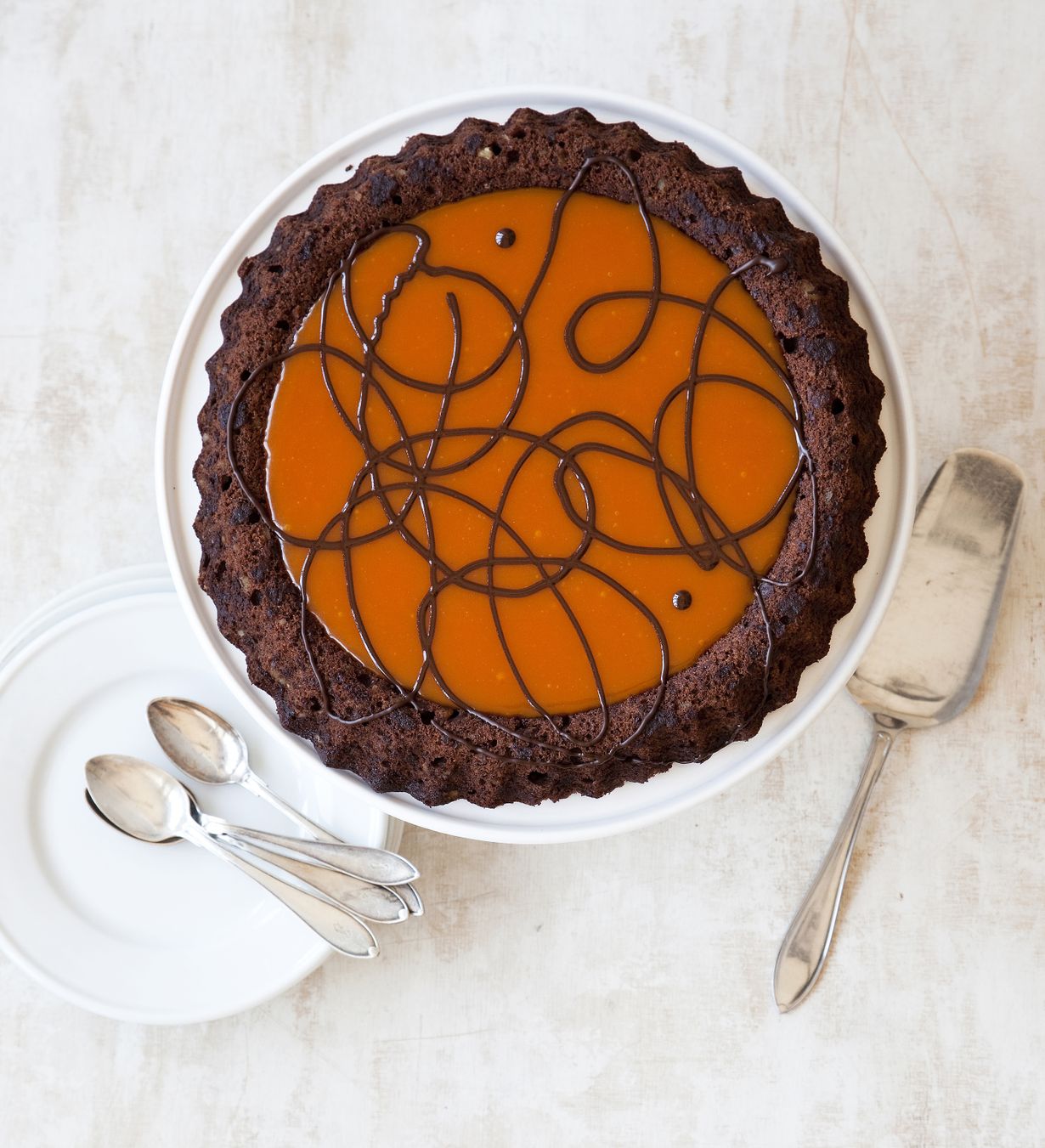 - Voitele (Ø 24 cm) torttuvuoka ja jauhota se kaakaojauholla.