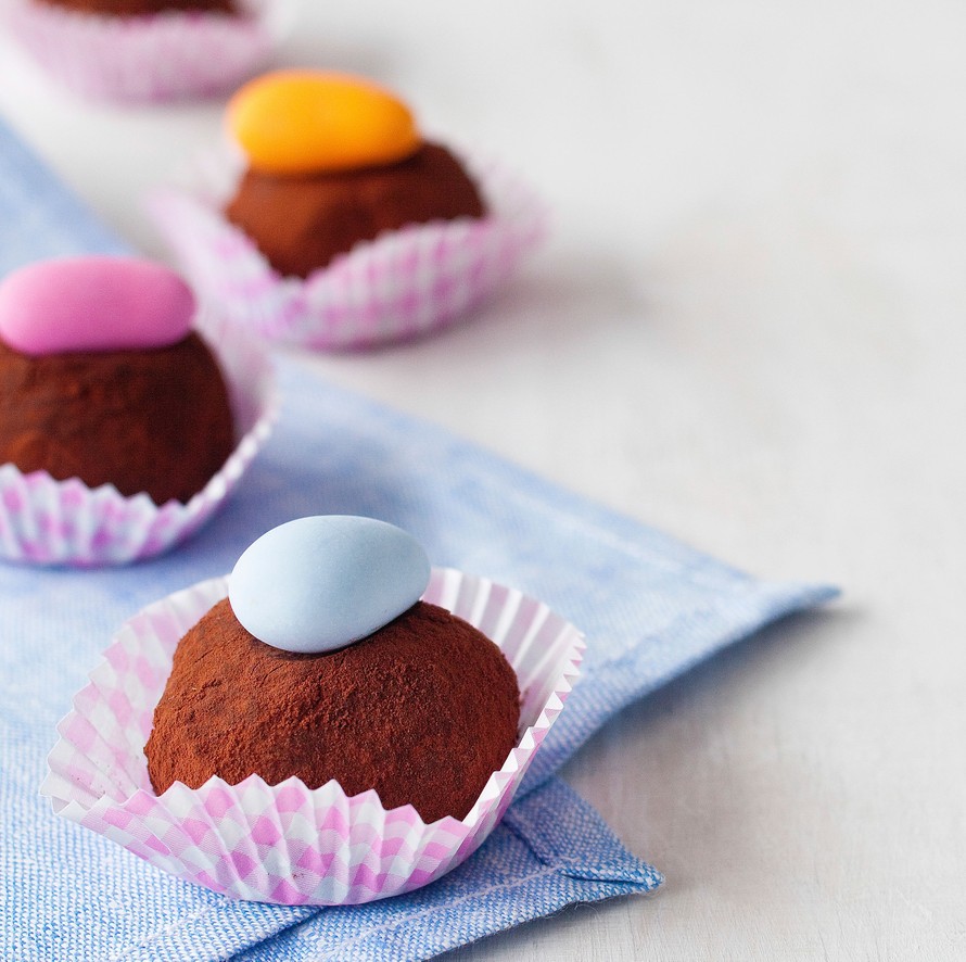 Nämä namupalat tehdään kaakaokakkumuruista ja pehmeästä suklaamassasta. Tryffeleistä riittää kahvipöytään vaikka koko pääsiäiseksi. Tryffelit säilyvät jääkaapissa viikon.