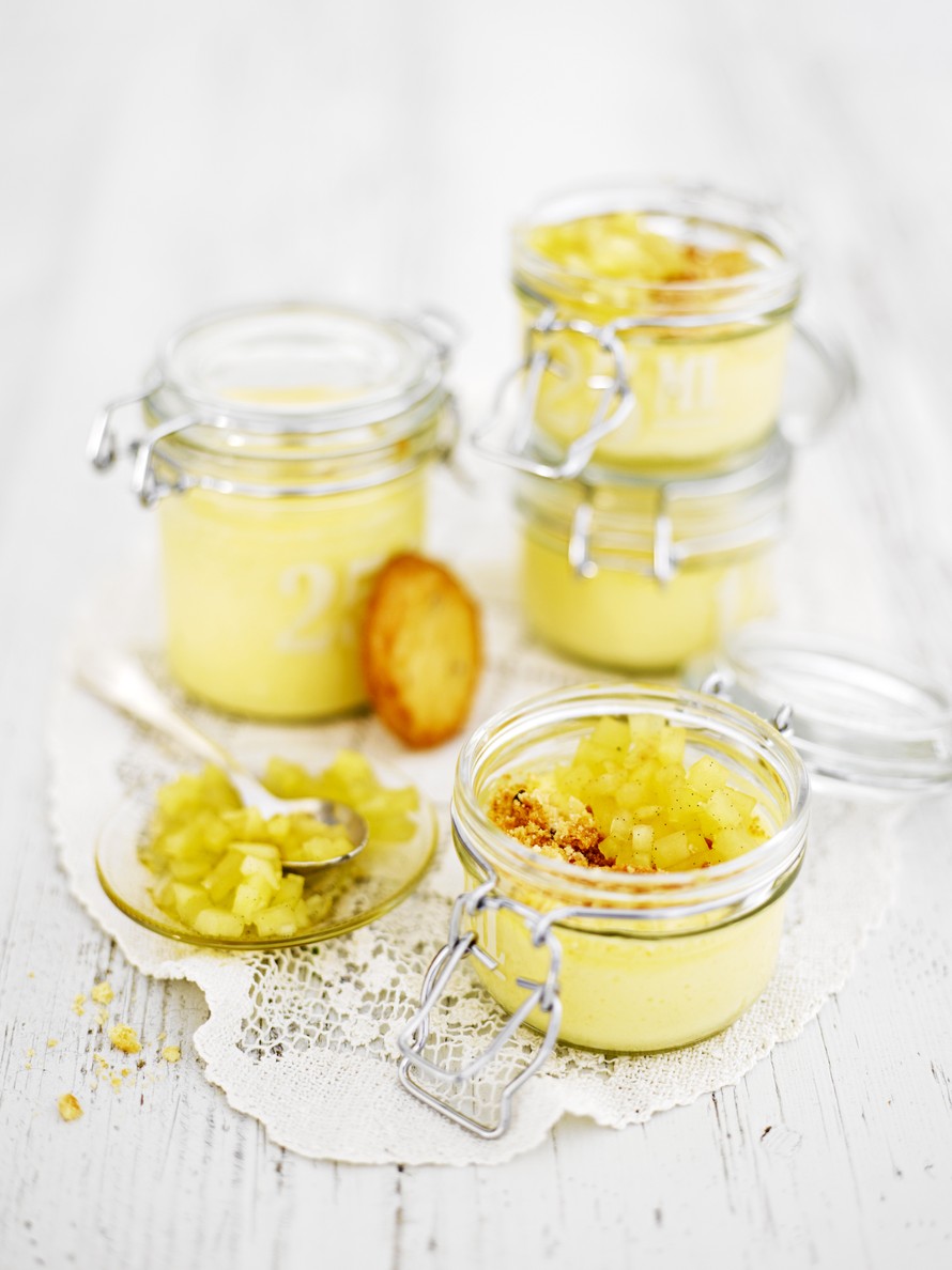 Sitruunainen juustokakku sai hauskan vanukasmaisen muodon. Sen kanssa tarjotaan omenaista hilloketta ja keksinmuruja. Keksit voi halutessaan murustella jo ennen paistamista purkkien pohjalle.