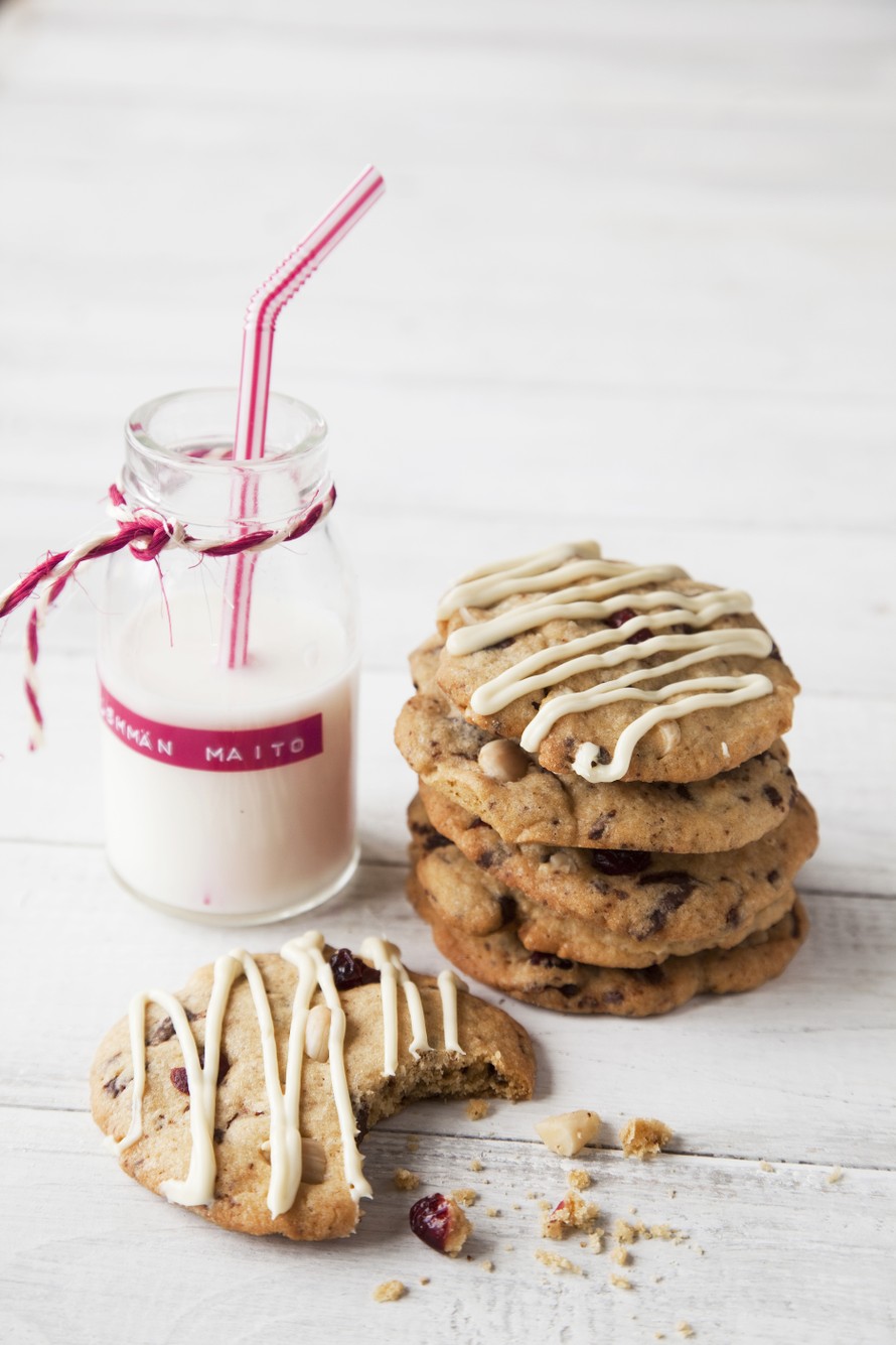 - Sulata valkosuklaa raidoitusta varten mikrossa. Voit käyttää jäähtyneiden keksien koristeluun pursotinta tai tehdä raidat lusikan avulla. Tarjoa kylmän maidon kanssa.