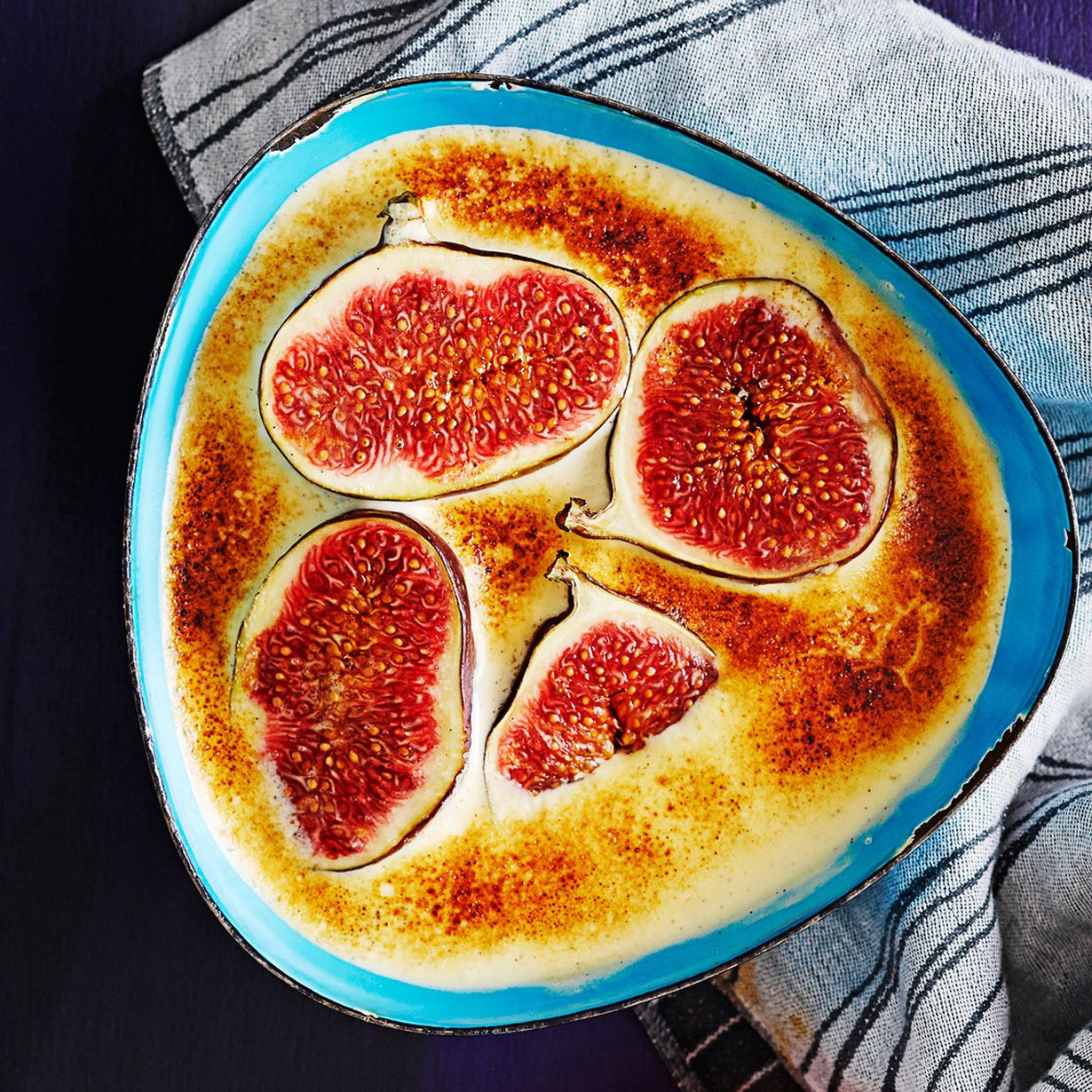 - Juuri ennen tarjoamista halkaise viikunat kahtia. Kaada sabayon uunin kestävään tarjoiluastiaan tai annosvuokiin. Asettele viikunanpuolikkaat päälle. Ripottele ruokosokeri pinnalle.