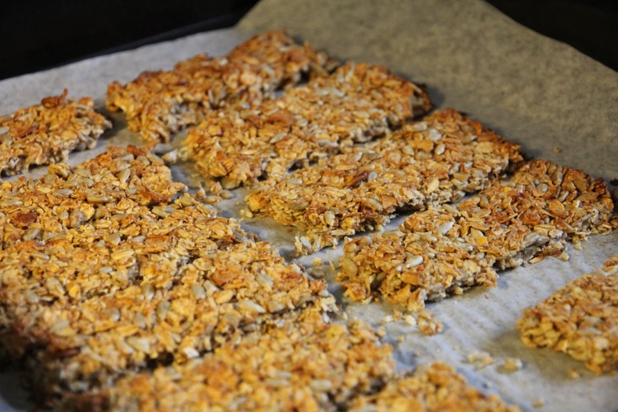 Sekoita kaikki ainekset yhteen, ja levitä taikina leivinpaperilla vuoratulle pellille. Muotoile n. 1,5cm paksuiseksi neliöksi. Paista uunin keskitasolla n. 20 min.