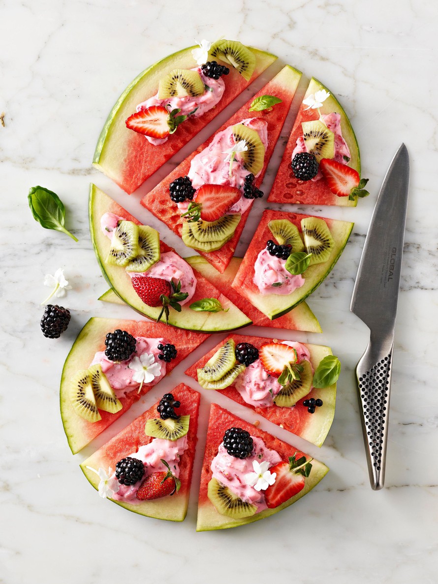 Melonipizza on näyttävä ja ihanan raikas kesäjälkkäri. Lastaa vesimeloniviipaleet mansikka-tuorejuustotäytteellä, hedelmillä ja marjoilla.