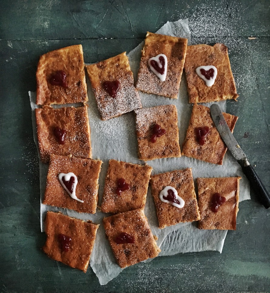 - Leikkaa jäähtynyt pannari paloiksi. Pursota palojen päälle hillosilmät ja reunusta ne sokerikuorrutuksella. Tarjoa jälkkärinä.