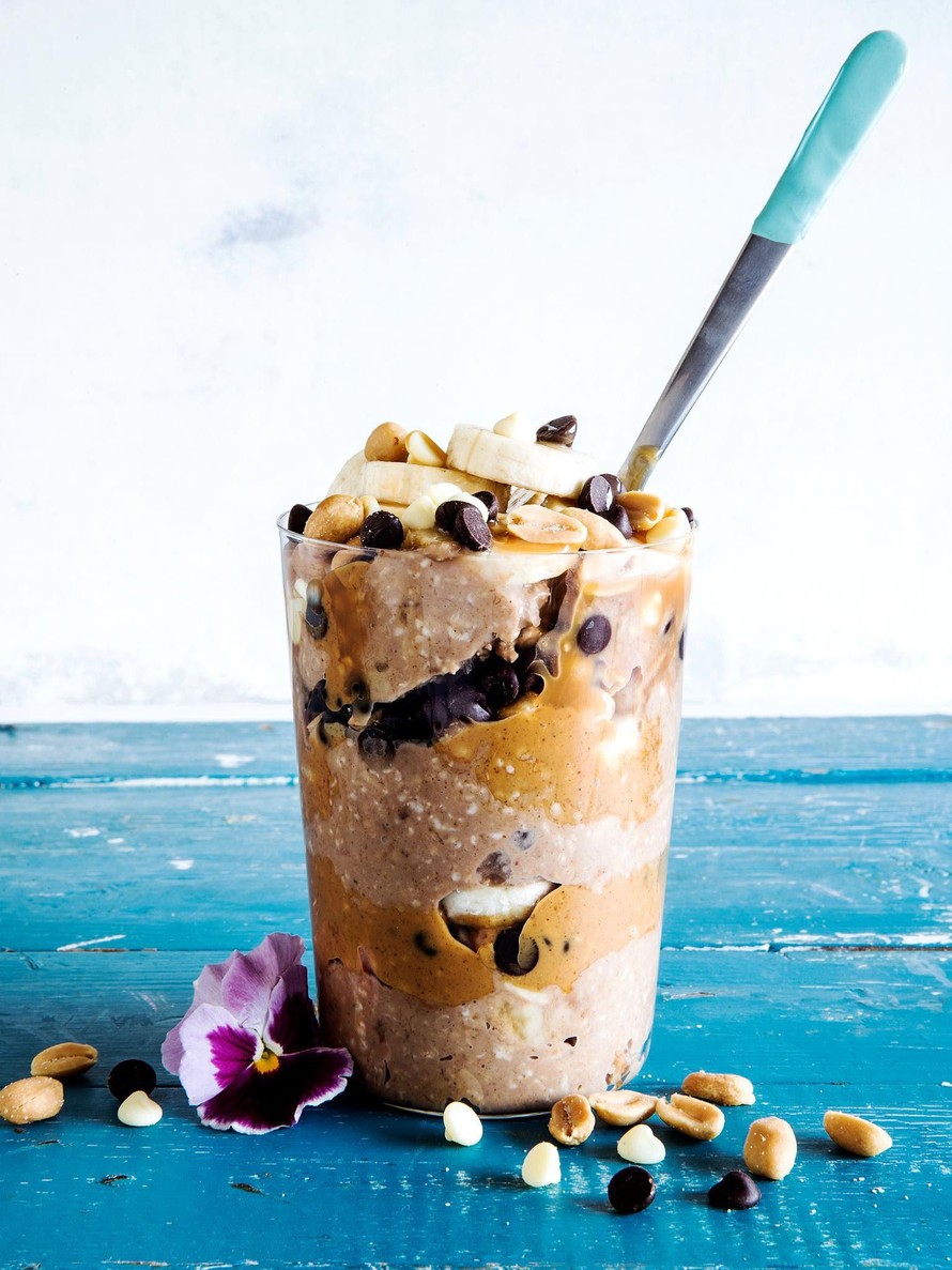Vinkki! Tuorepuuron voi myös latoa lasiin kerroksittain niin, että maapähkinävoita, kinuskia ja suklaata on puurokerrosten välissä.