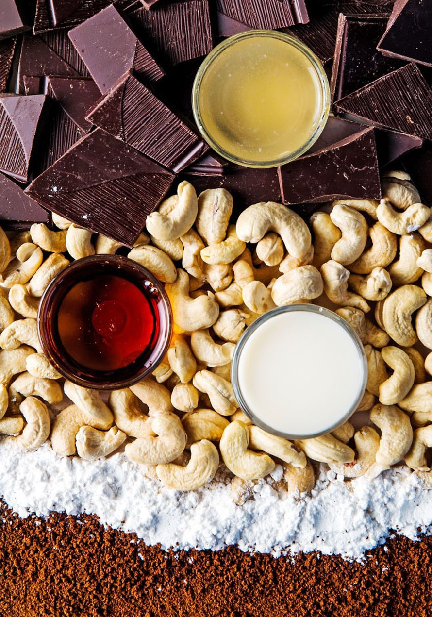 - Soseuta pähkinät, kauramaito, siirappi, sokeri ja pikakahvijauhe tehosekoittimessa. Kääntele sula suklaa ja kikhernevaahto varovasti joukkoon.