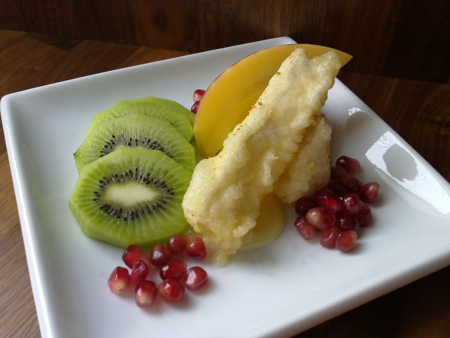 Friteerattu juusto maistuu jälkiruokana suosikkihedelmien kanssa.
