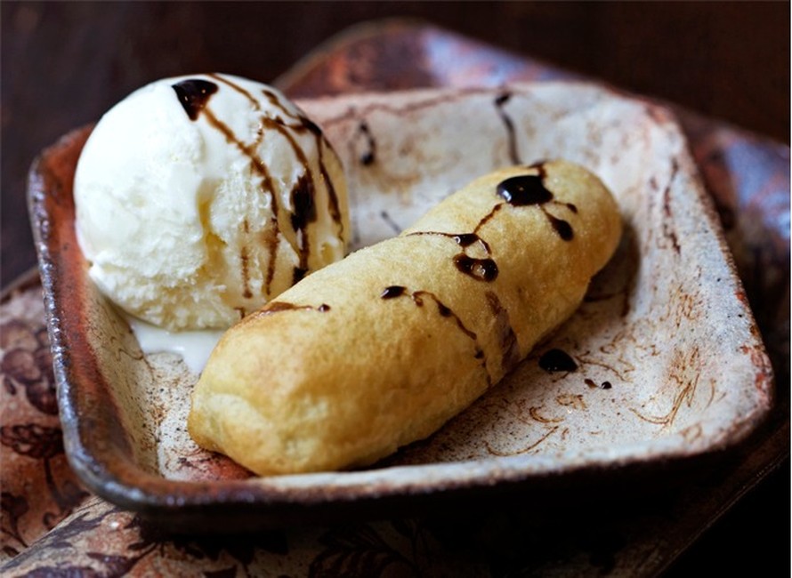 - Uppopaista banaaninpalat yksitellen molemmin puolin, kunnes pinta on saanut kauniin värin ja nosta reikäkauhalla talouspaperin päälle lautaselle valumaan. Tarjoa heti jäätelöpallon kera.