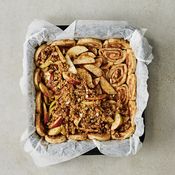 Sekoita pehmeä rasva, kaurahiutaleet, mantelirouhe, fariinisokeri ja kaneli tasaiseksi tahnaksi. Levitä omenoiden päälle..