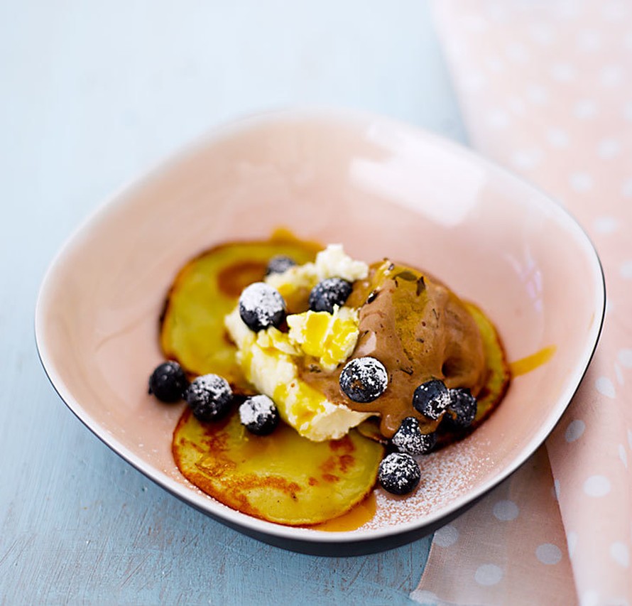 - Paista lettutaikinasta rasvatulla pienellä pannulla ohuita räiskäleitä. Kokoa letut, jäätelö ja vaahto annoksiksi. Koristele mustikoilla ja viimeistele mangokastikkeella.