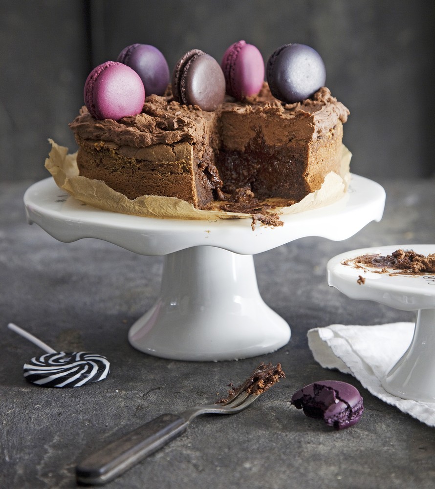 - Levitä kuorrutus kakun päälle heti, sillä se jähmettyy nopeasti. Koristele kakku macaronkekseillä. Laita jääkaappiin tarjoamiseen asti.