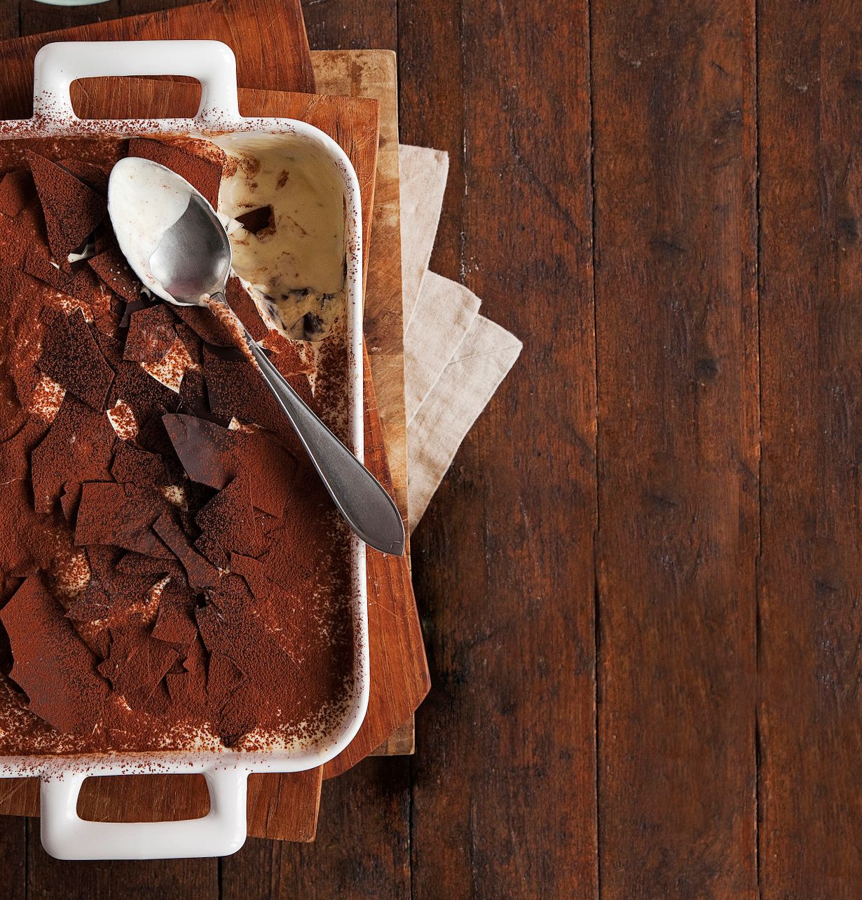 Lusikoi jäätelöä vuoan pohjalle ja murra ohuesta suklaalevystä päälle suklaalastuja. Toista sama, kunnes astiassa on useita kerroksia. Anna annoksen kovettua kylmässä vähintään pari tuntia. Koristele pinta kaakaojauheella ja lopuilla suklaalastuilla.