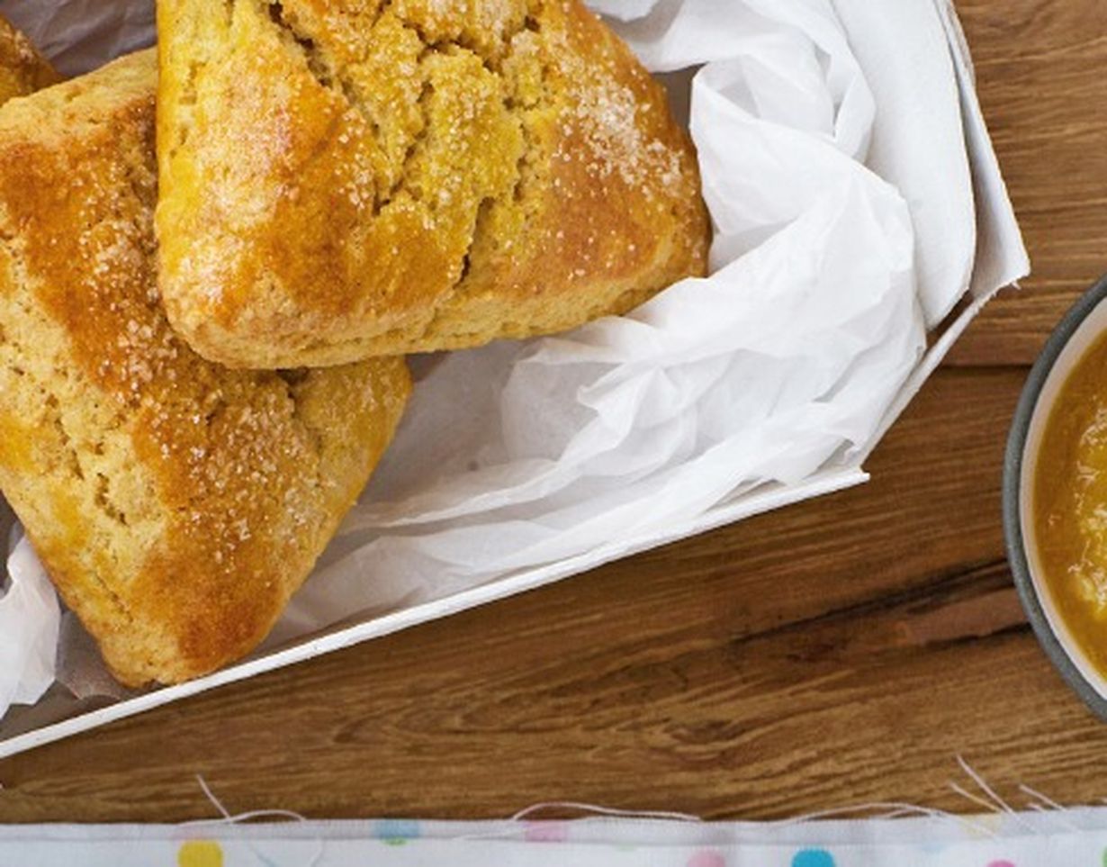 - Leikkaa levy kahdeksaan kolmionmuotoiseen palaan. Nosta ne leivinpaperin päälle pellille ja voitele munalla. Kypsennä skonsseja uunin keskiosassa 12–15 minuuttia. Tarjoa muutaman tunnin kuluessa paistamisesta.
