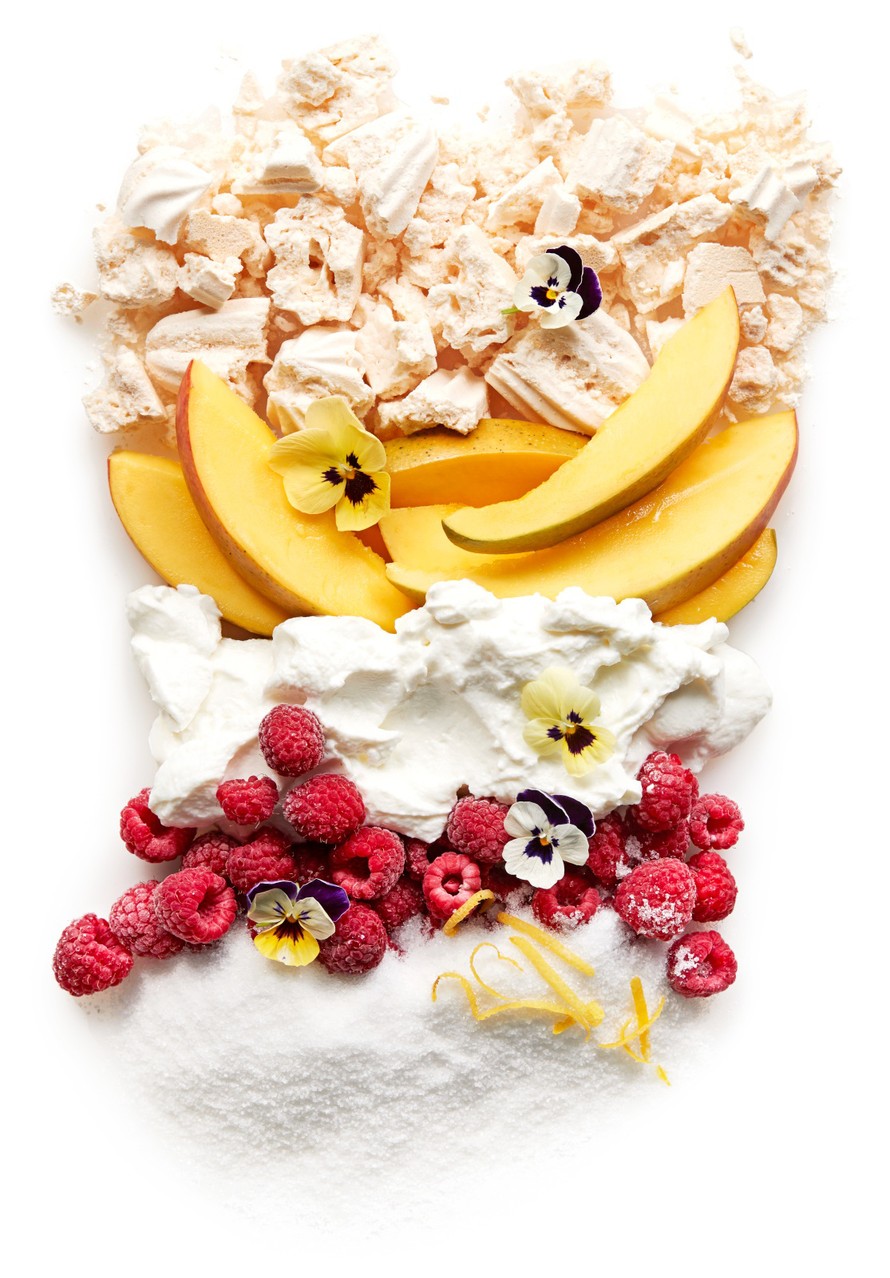 - Laita rahkaa, mangoa, marenkia ja vadelmia kerroksittain tarjoilukulhoon. Koristele orvokeilla