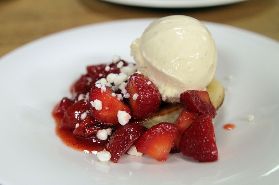 Sitruunajäätelö maistuu yllättäen juustokakulta. Mansikkahilloke ja valkosuklaa-crumble tuovat ryhtiä jälkiruokaan.