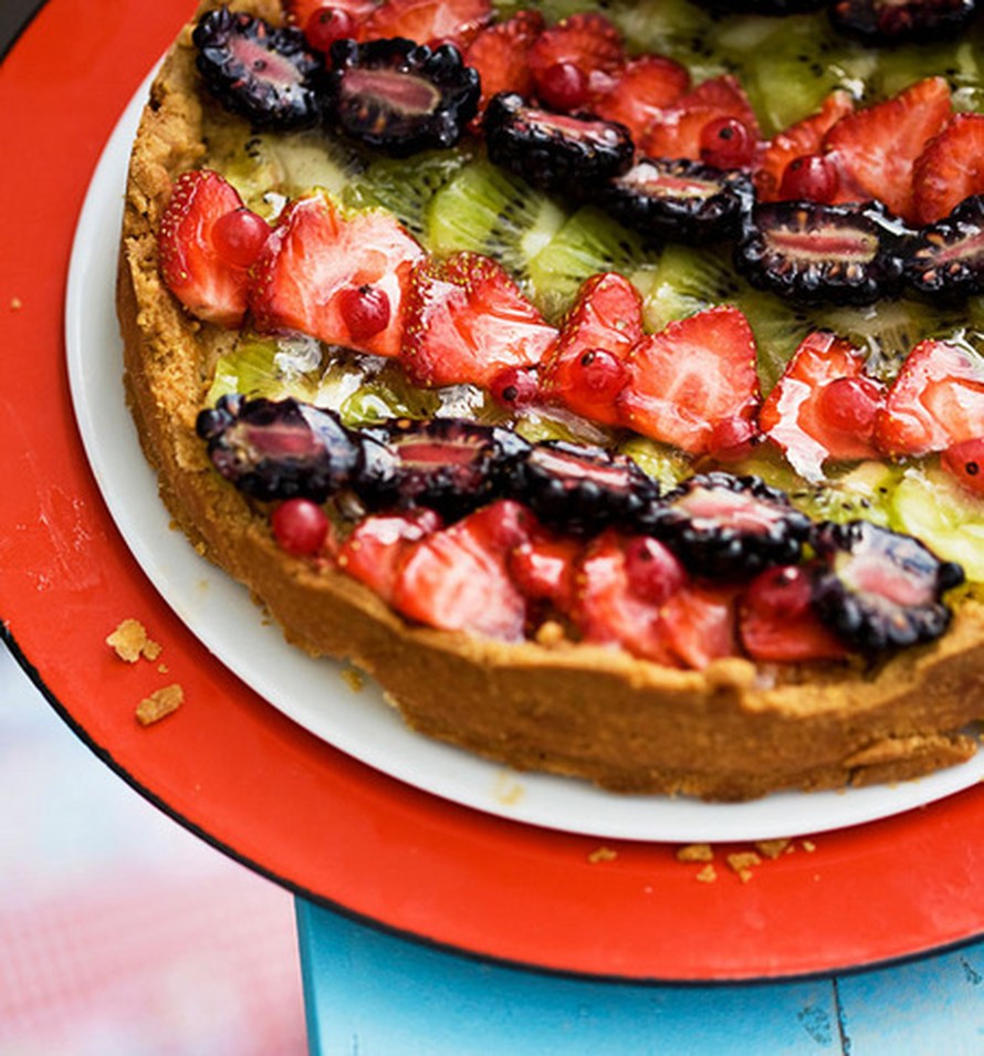 - Päällystä pinta marjoilla ja hedelmäpaloilla. Kiehauta sitruunamehu kattilassa ja lisää siihen hyytelösokeri koko ajan sekoittaen. Hämmennä, kunnes liemi kirkastuu.