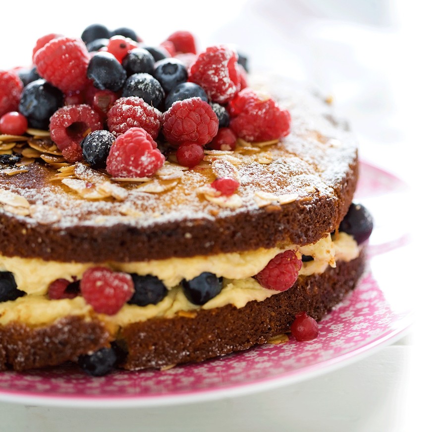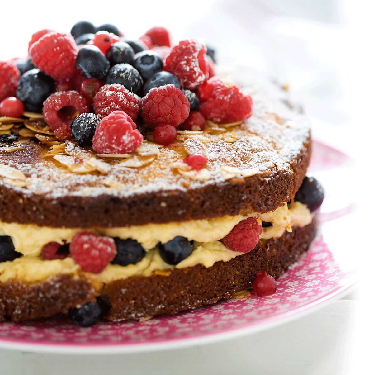 - Kokoa torttu. Levitä torttupohjalle kerma-vanilja-jogurttiseos ja sitten marjoja. Nosta toinen torttusiivu päälle.