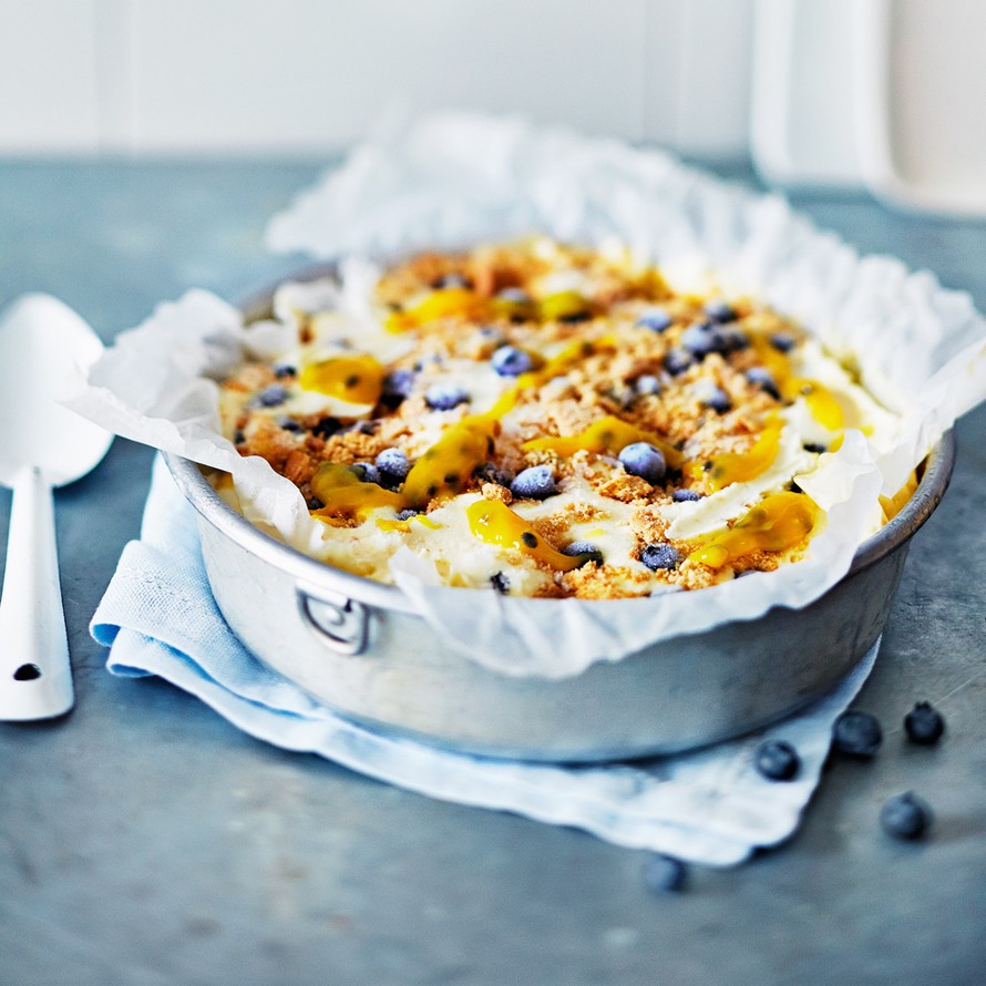 - Laita vuokaan kerroksittain jäätelömassaa keksinmurujen ja marjojen kanssa. Peitä kelmulla ja pakasta 4 tuntia välillä sekoitellen.