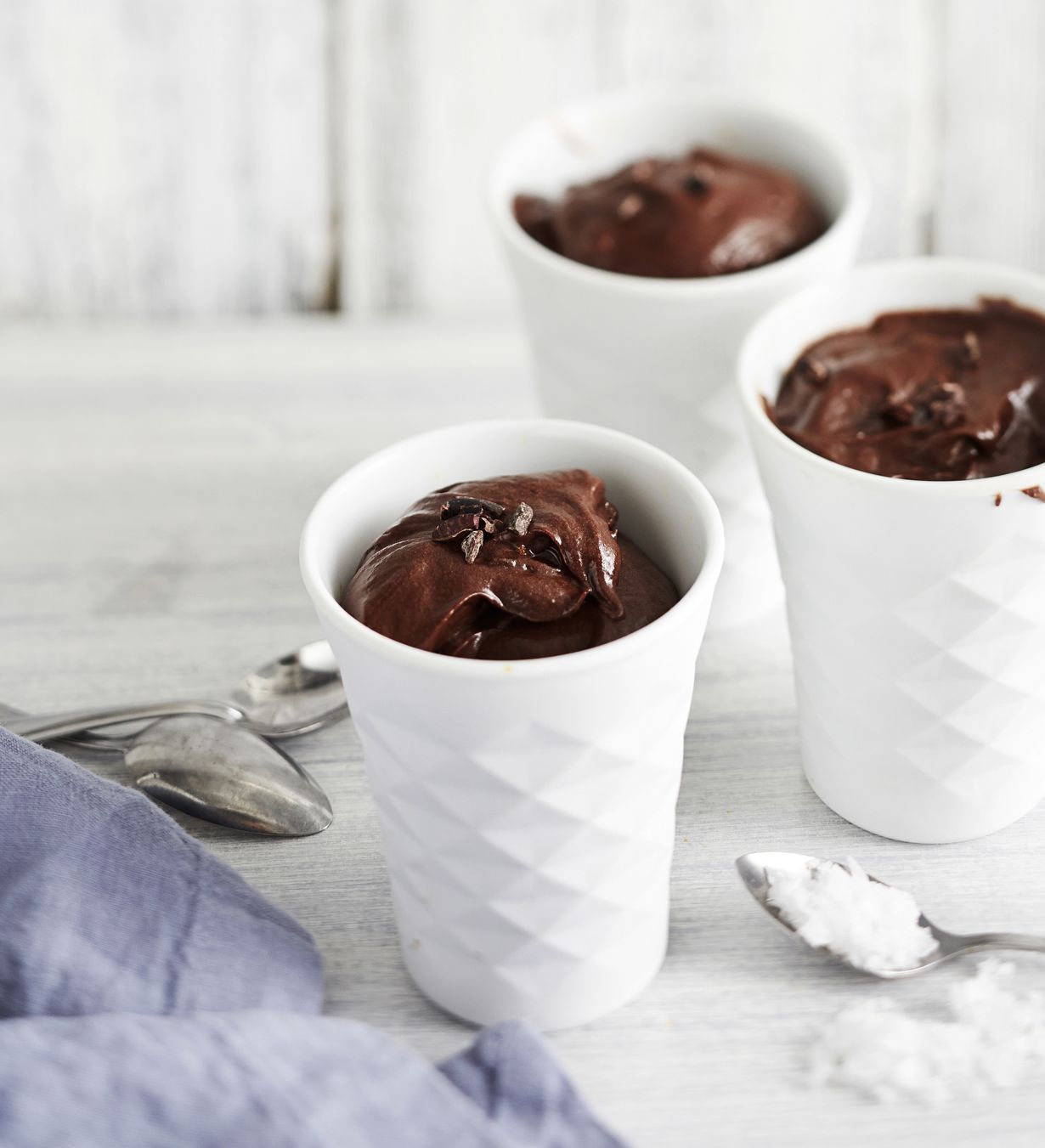 - Pese appelsiini ja raasta kuori suklaamoussen joukkoon. Lisää kaakao-nibsit. Kääntele varovasti. Annostele jälkiruoka laseihin ja ripottele pinnalle pari suolakidettä.