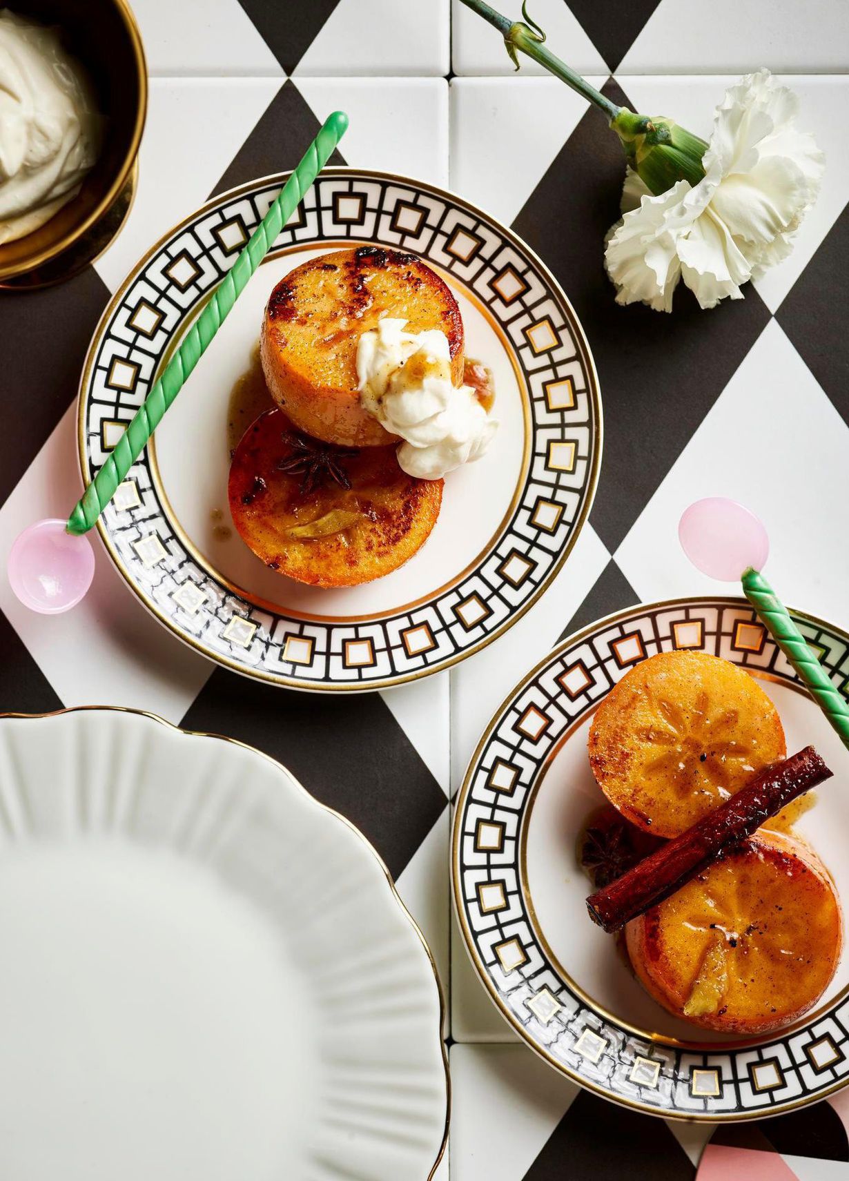 Vatkaa sillä aikaa mascarpone, kuohukerma ja vaniljasokeri keskenään sähkövatkaimella vaahdoksi. Tarjoa persimonien (ja vuokaan valuneen liemen) kanssa.