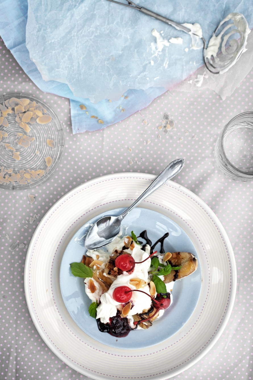 - Grillaa maustuneisiin banaaneihin parilalla kaunis paistopinta ja kokoa annokset. Pane lautasille banaanit ja lisää päälle rahkaseosta sekä jäätelöpallo. Viimeistele annos kirsikkahillolla, kirsikoilla, mantelilastuilla ja suklaakastikkeella. Nauti heti.