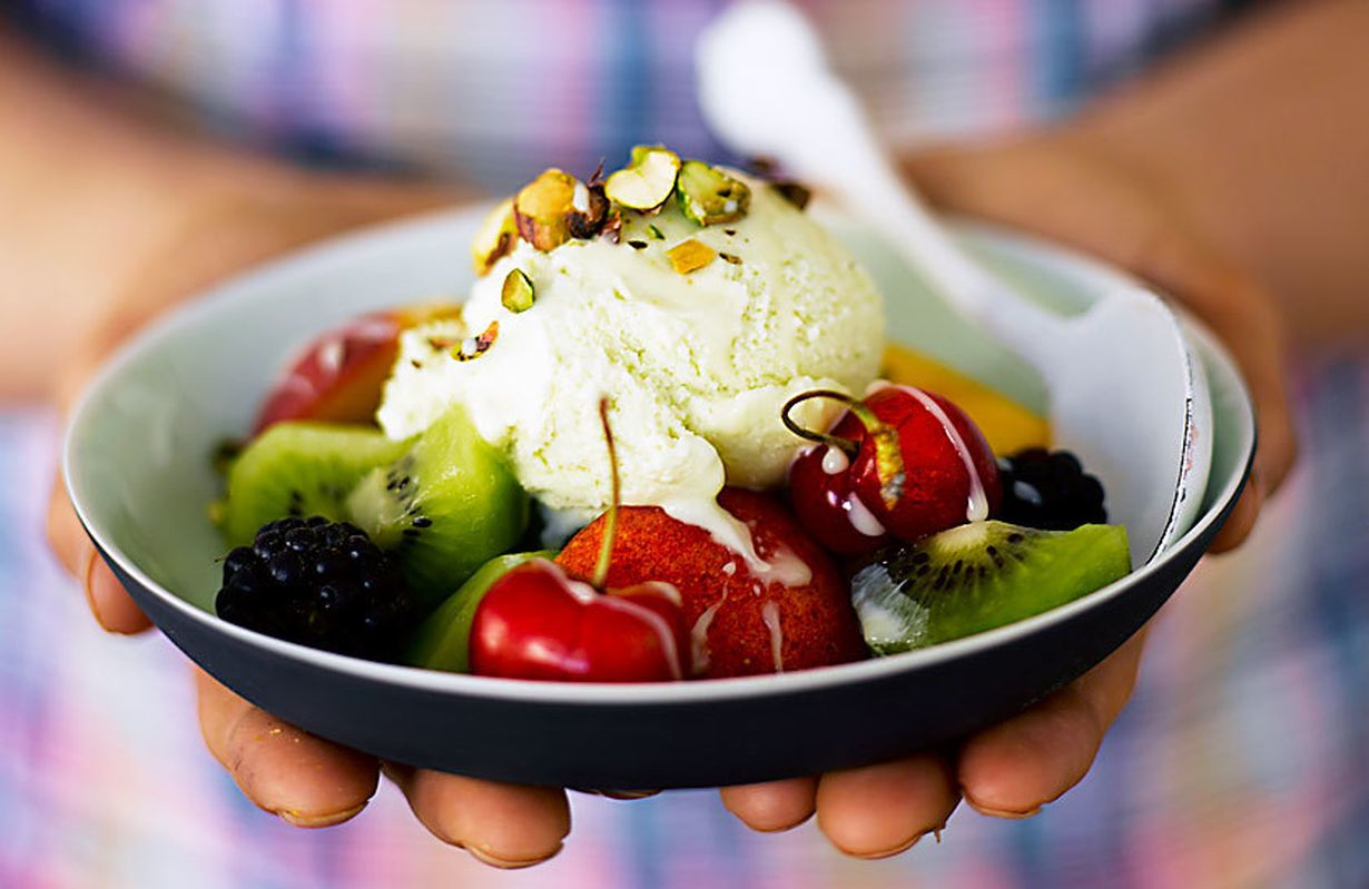 - Pyörittele lautaselle pistaasijäätelöpallo ja lisää ympärille pilkottua kiiviä ja persikkaa, boysenmarjoja ja tuoreita kirsikoita.