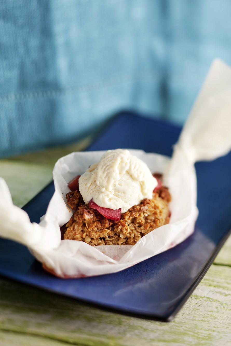 Laita päälle kaurahiutalekuorrute ja kypsennä 180 °C uunissa 20 minuuttia.