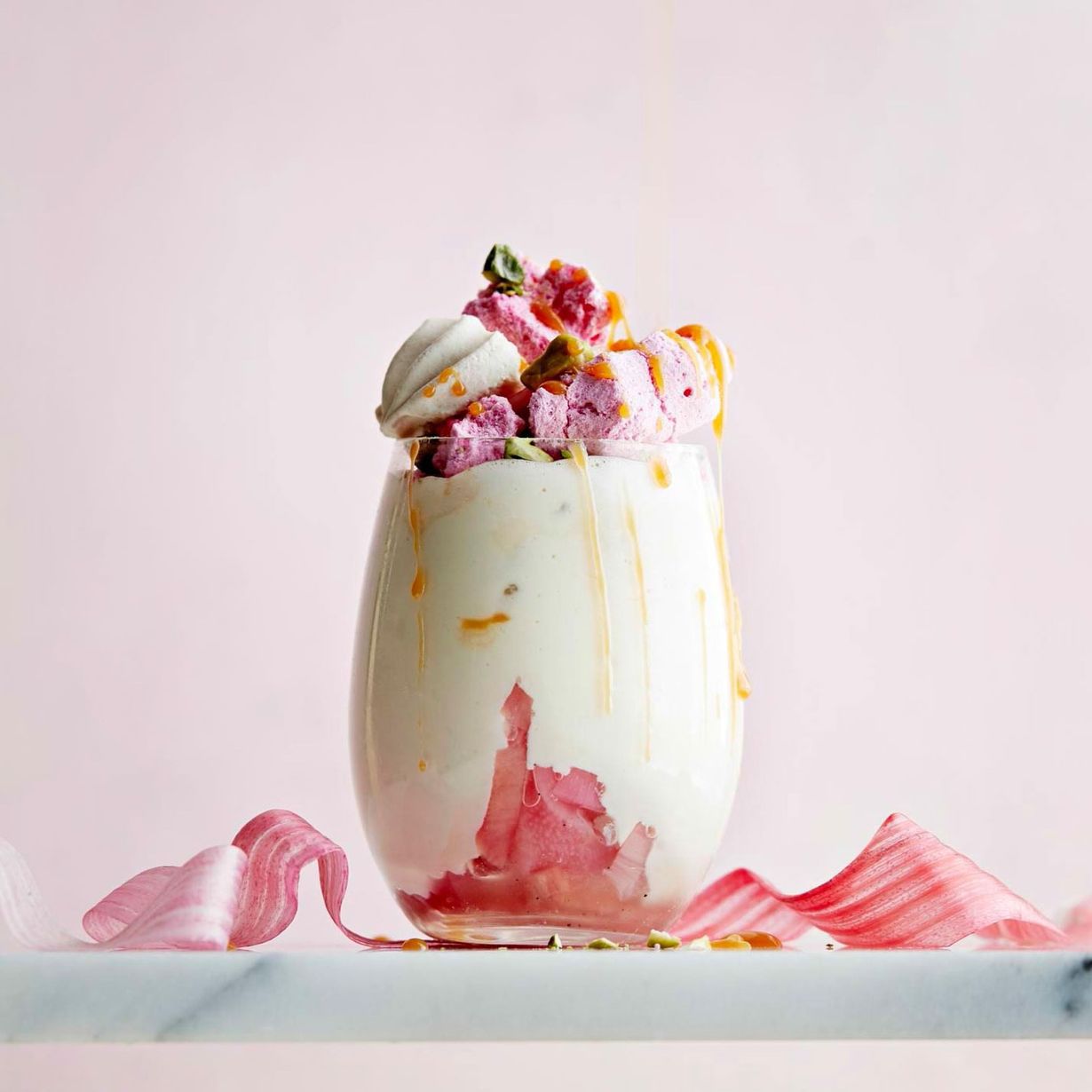 3. Lado laseihin vuorotellen raparperia, valkosuklaavaahtoa, pistaasipähkinöitä, kinuskikastiketta ja marenkia.