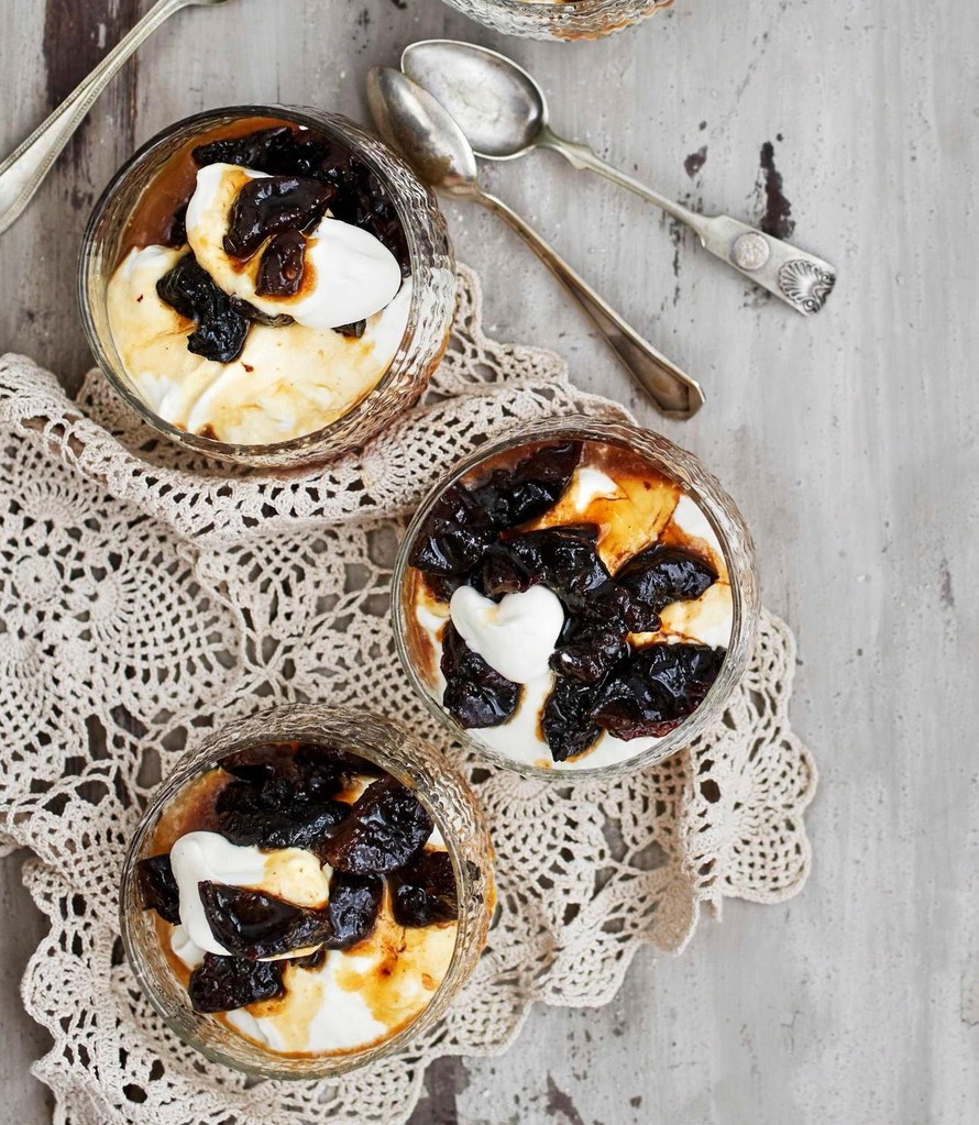 - Nostele annoskulhoihin kerroksittain rahkaa ja aavistuksen lämpimiä rommiluumuja. Tarjoa heti.