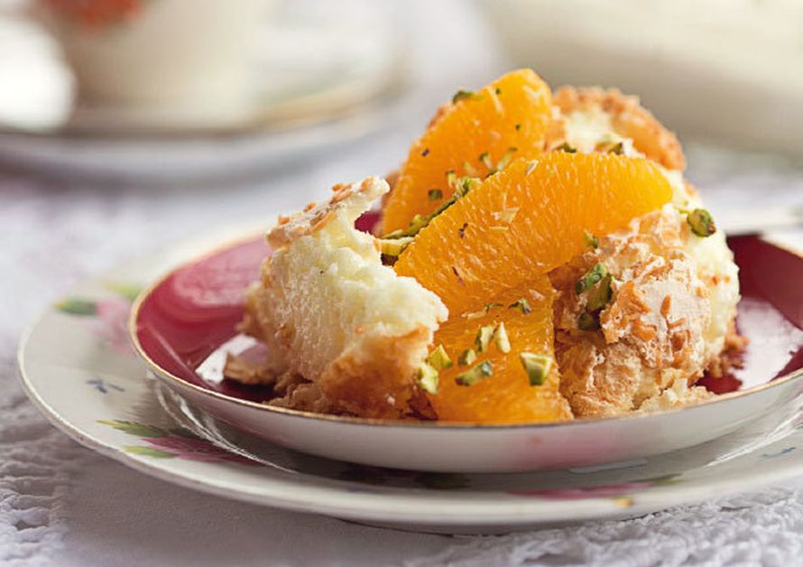 Mehukkaat appelsiinit maistuvat pehmeän marengin kanssa.