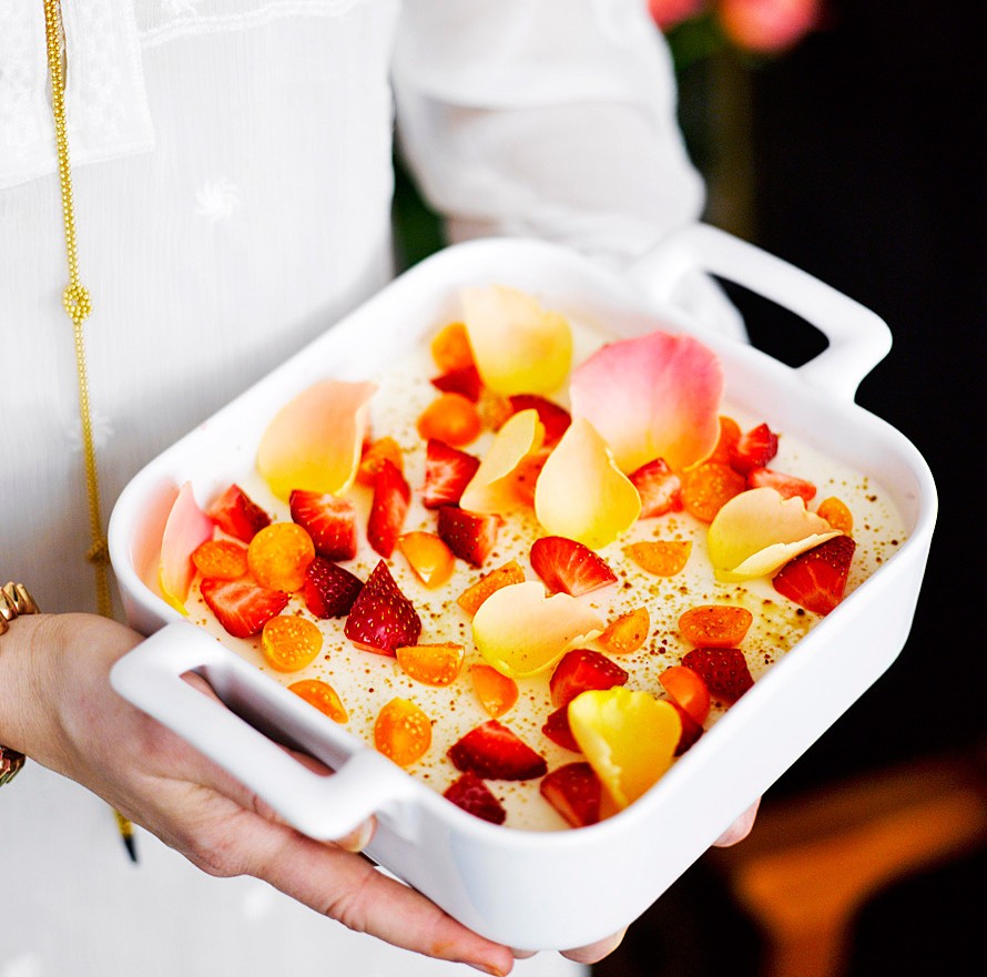 - Laita liivatelehdet kylmään veteen likoamaan. Yhdistä maito, sokeri, kerma ja vaniljatanko kasarissa ja kuumenna melkein kiehumispisteeseen. Lisää ruusuvesi.