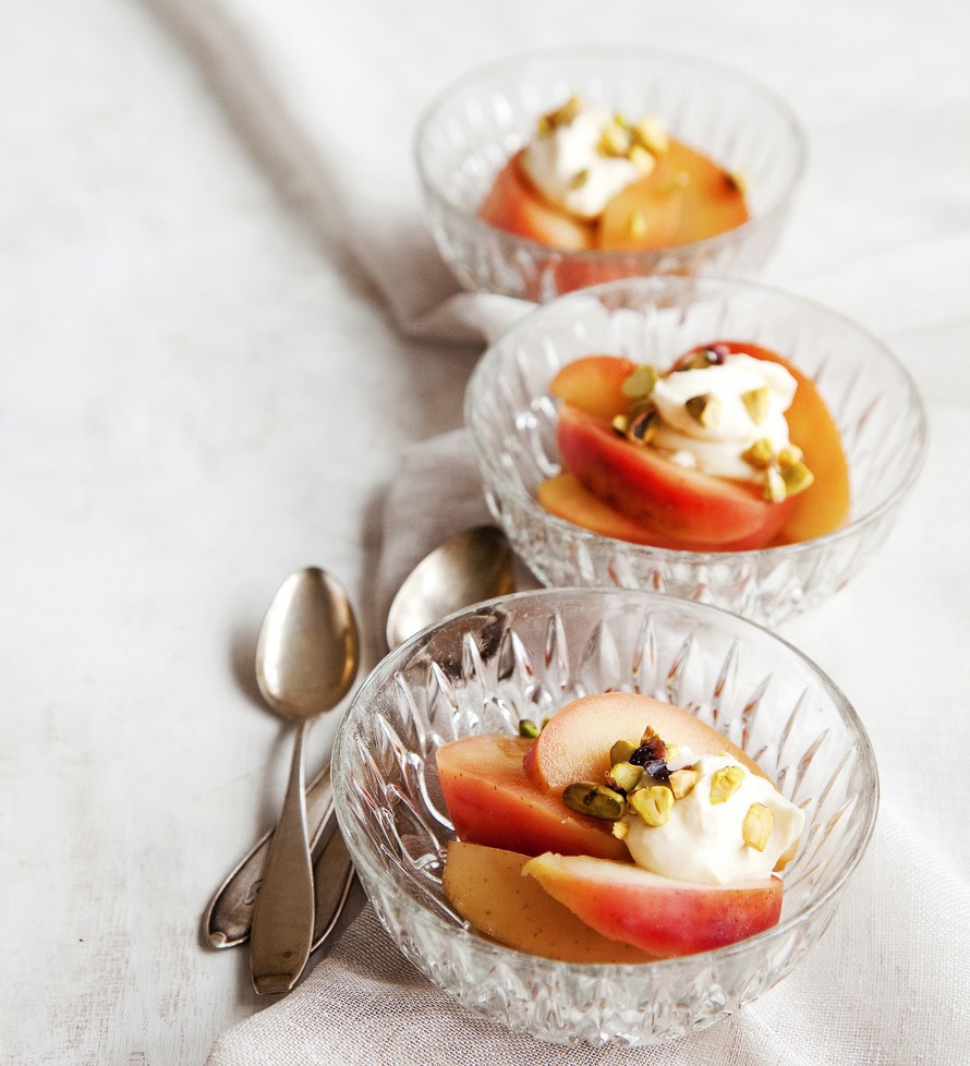 - Vaahdota smetana sähkövatkaimella. Sekoita vaahterasiirappi vaahtoon. Rouhi pistaasit muutamaan osaan leikkuulaudalla.