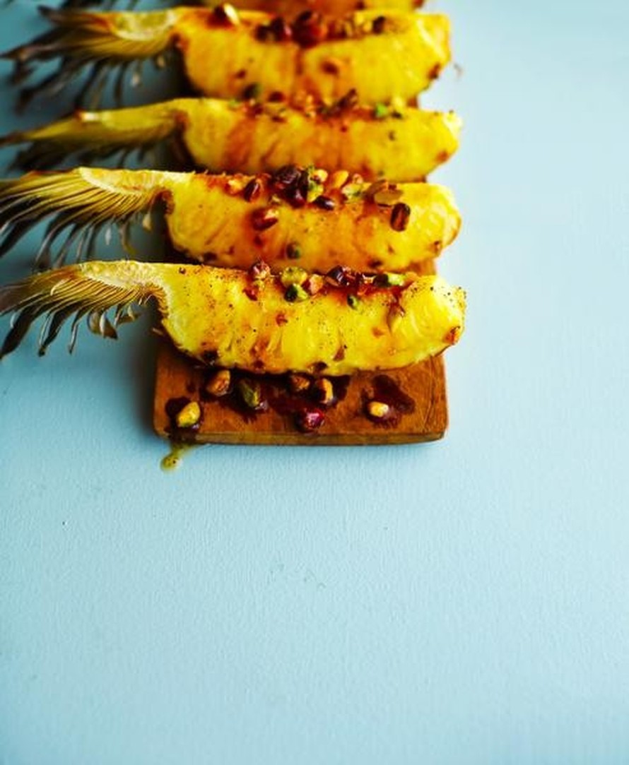 - Sulata voi ja lisää joukkoon kardemumma. Valele ananaksen pinta maustevoilla. Valuta pinnalle tummaa siirappia. Rouhi pistaasipähkinät ja ripottele ne ananaslohkojen pinnalle.