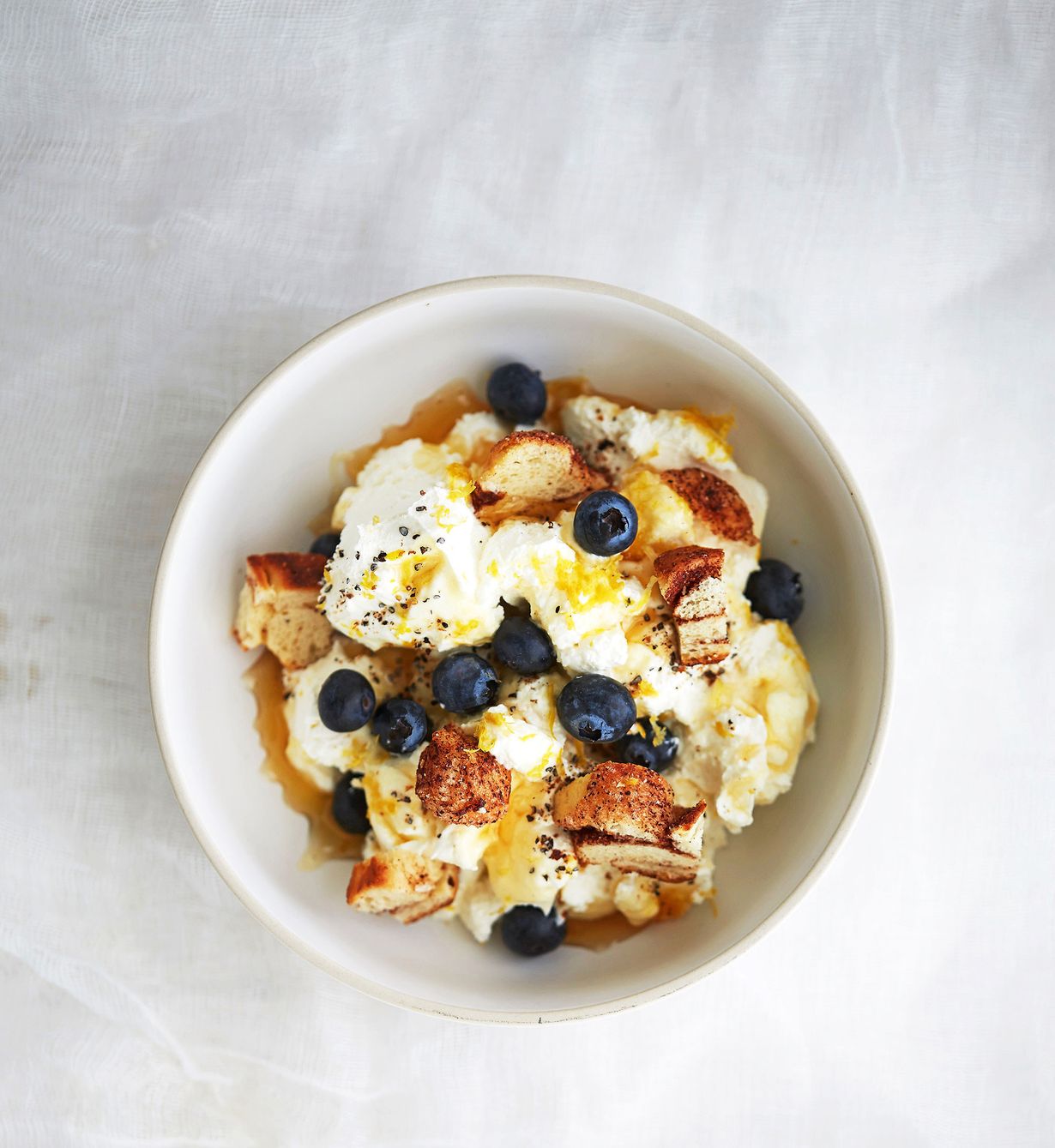 Taivaallisen pehmeä labneh nautitaan korvapuustikorppujen ja tuoreiden mustikoiden kanssa.