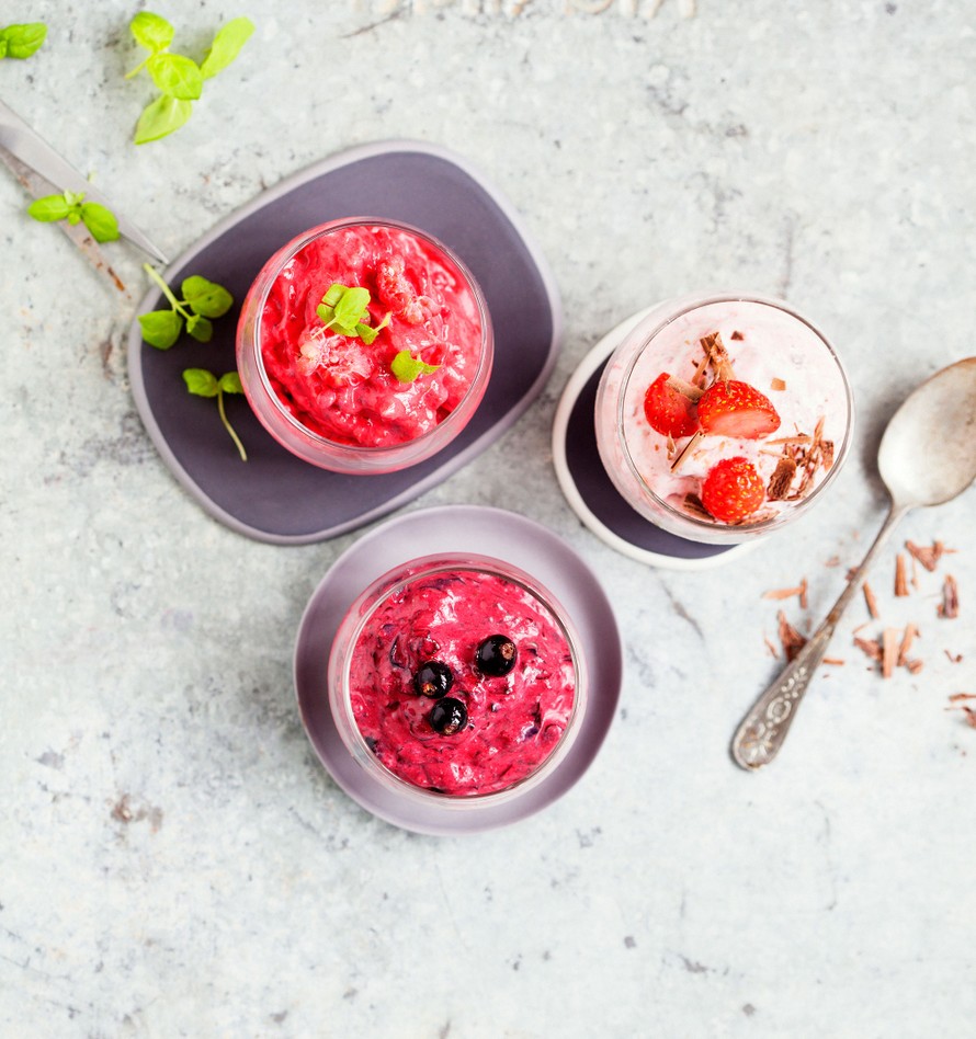 Nämä helpot "marjajäätelöt" ovat vähän kuin smoothien jälkiruokaversioita. Ideana on soseuttaa tehosekoittimessa marjoja ja sokeria ja kuohkeuttaa massa sitten lorauksella kermaa.