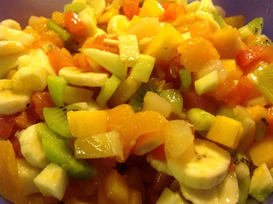 Tämä hedelmäsalaatti on meillä semmosta herkkua, ettei ihan pieni määrä riitäkään! Hedelmäcocktailia käytän sen ison purkin ja muita säilykkeitä 2 tölkkiä. Hedelmiä taas tuplamäärä. Liemen teen kuitenkin yksinkertaisena, 1l omenamehua ja sitä rataa.