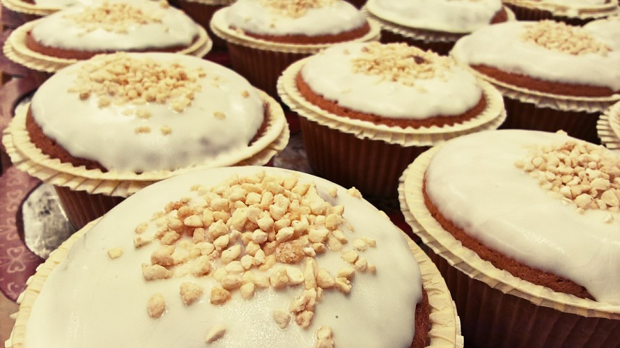 Kun muffinit on jäähtyneet, kasta muffinien päät valkosuklaassa, pintaan riisikrokantti.