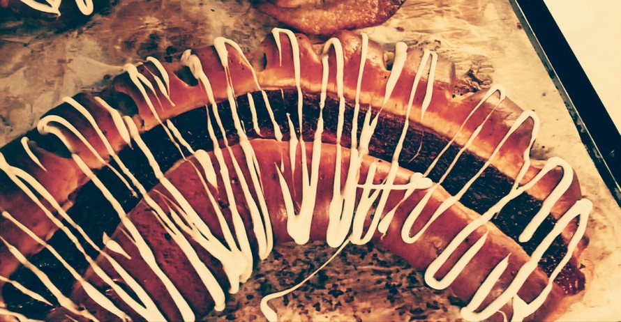 Voitele pitkot kananmunalla ja pursota pinnalle raita kreemiä ja mansikkaa. Paista 200 asteisessa uunissa noin 15 minuuttia.