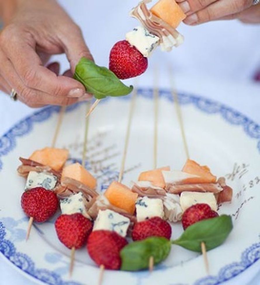 - Pujota herkkupaloja varrastikkuihin siten, että kärkeen tulee aina basilikanlehti.